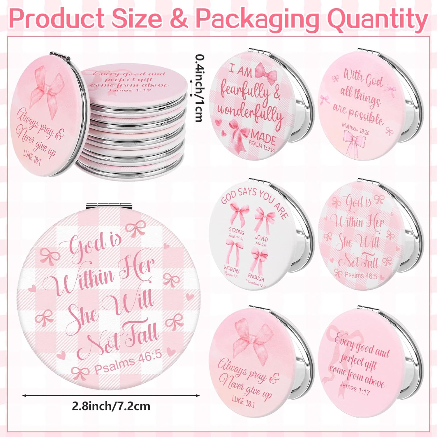 12 Pcs Christian Gifts for Women Pink Bow Coquette Mini Christian Compact Mirrors Bible Verse Portable Pocket Makeup Mirror Inspirational Religious Baptism Gift for Girls Coworkers Teacher EmployeesFeature:These inspirational religious gifts for women feature pink bow design on the cover with motivational fonts and words, these designs uniquely celebrate Christian faith, making Bible study engaging and uplifting, ideal church events, bible study groups, graduations, birthdays, or as “just because” gifts, class of 2025 and end of school year gifts.Specifications:Material: PU leather, tinplateColor: pink, whiteSize: approx. 2.83 inches/ 7.2 cmPackage includes:12 x Coquette bible compact mirror