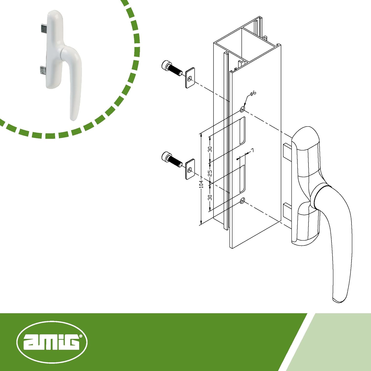 | Item Type Name | Amig - Handle for practical, hinged or hinged windows with aluminium base and PVC cover in white with concealed screw-in | 172 x 27 mm · Height 59 mm · Without square |
