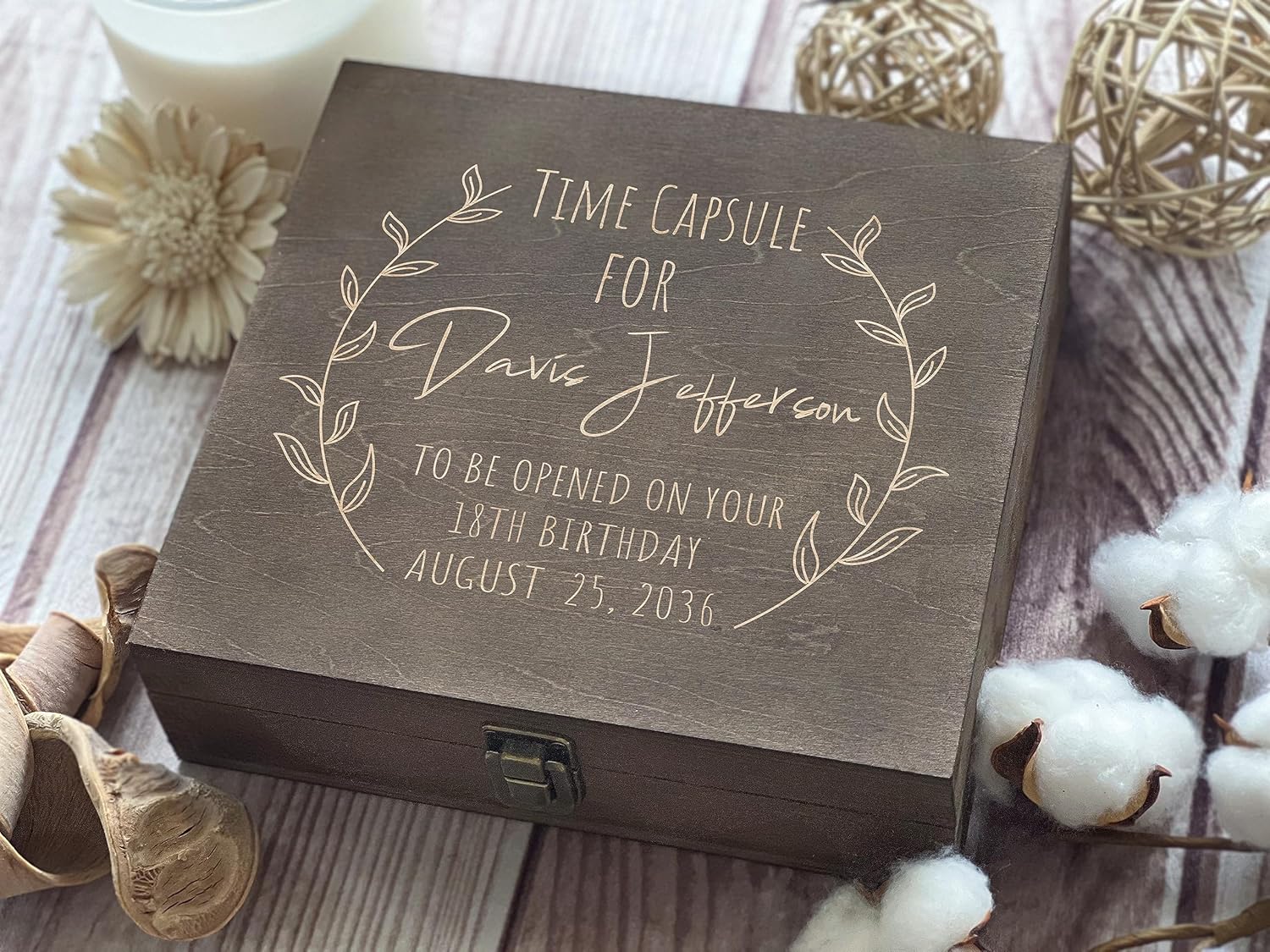 Celebrate the magic of your baby's first year with the 1st Birthday Time Capsule. This engraved keepsake box is designed to be opened on your 18th birthday, allowing you to revisit the precious memories and milestones from your early years. Fill it with photos, letters, and small mementos that capture the essence of this special time. From the first steps to the first words, this baby's memory box holds the key to a treasure trove of memories. Not only is it a cherished keepsake for you, but it also makes a thoughtful wedding anniversary gift, symbolizing the enduring love and commitment shared by couples. Crafted with care and featuring a beautiful engraving, this 1st birthday time capsule is a timeless gift that will be treasured for generations. Create lasting memories, celebrate milestones, and embark on a journey down memory lane with this heartfelt and sentimental keepsake. External Dimensions: Size 1 - 8.5 x 6 x 3 in Size 2 - 8.5 x 8x 2.5 in Internal dimensions: Size 1 - 7.8 x 5.37 x 2.5 in Size 2 - 7.75 x 7.3 x 1.95 in Wood craft engraved box - with laser engraving. Keepsake little memories - Handmade made with LOVE!