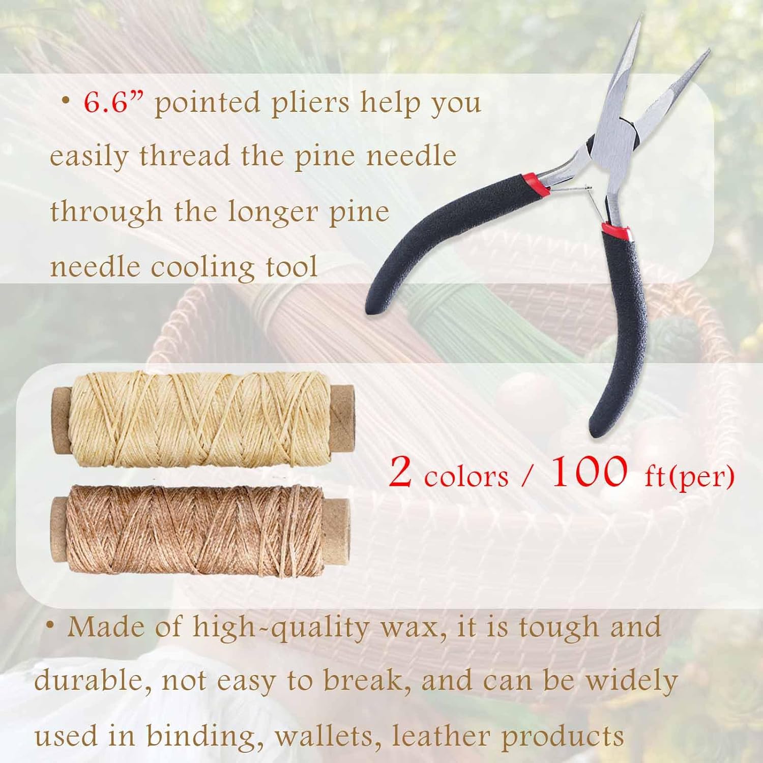 | Included Components | 5 size pine needle basket making gauge coiling tools, 2 waxed thread, 7 needles, 1 thimble ring, 1 needle nose pliers, 2 clamps |