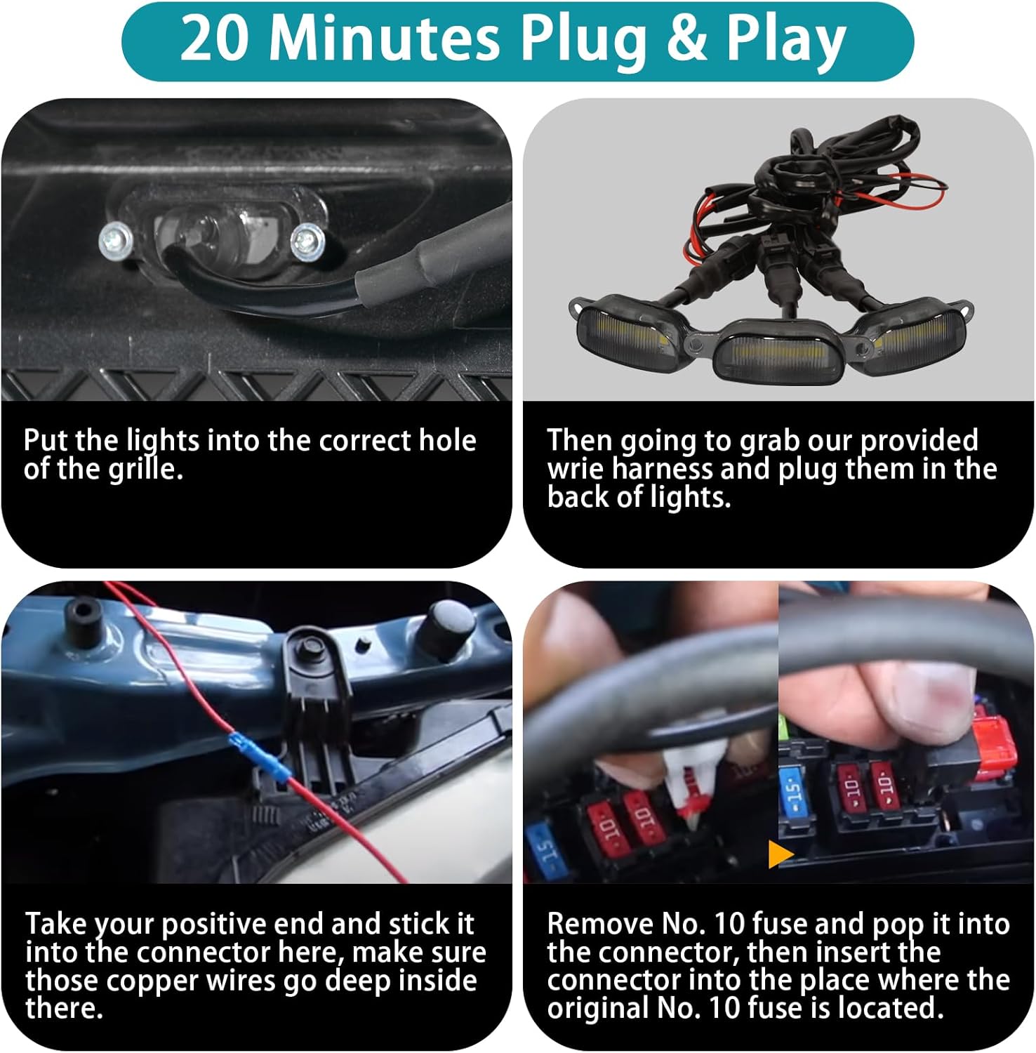 | Included Components | 1pc Fuse adapter, 3pcs Grill light+1 extra light for aftermarket service, 6pcs screws, Cables for 3 interfaces |
