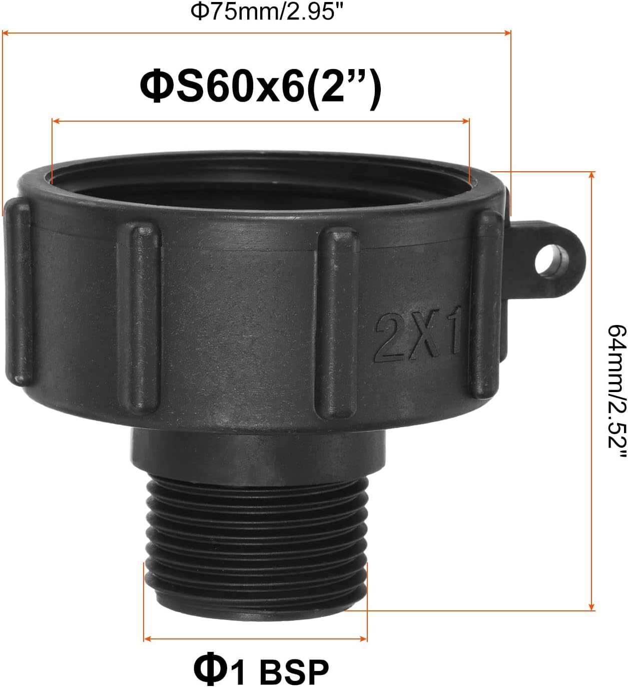 The IBC Tote Adapter provides a practical and effective solution for connecting hoses and other fittings to intermediate bulk containers (IBCs) and other large tanks (liquid, oil). Suitable for gardening, agriculture, food processing, and chemical handling.Specification:Color: BlackMaterial: PlasticFemale Thread Size: S60x6 (2")Male Thread Size: 1 BSPOverall Dimension: 60 x 76mm / 2.36 x 3 inch (H*Dia)Packing List: 4 x IBC Tote Joint FittingsAdvantage:Made of plastic material, high strength, and durability. The adapter features a female-to-male thread that securely fits onto the valve of the IBC, preventing leaks and spills.Instruction:The easy-to-install design allows for quick connection and disconnection. Install the adapter onto the valve of the IBC or tank, ensuring a secure fit. Connect the hose or fitting to the adapter.NOTE:Ensure that the adapter size is compatible and use only compatible hoses and fittings. Ensure that the connection is secure before use.