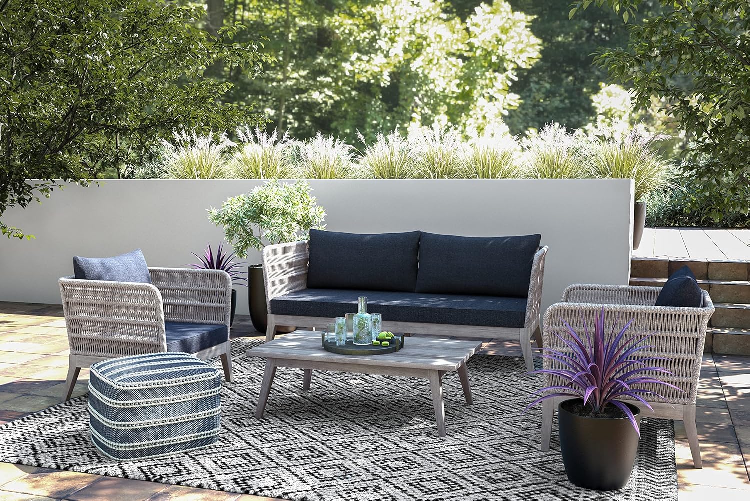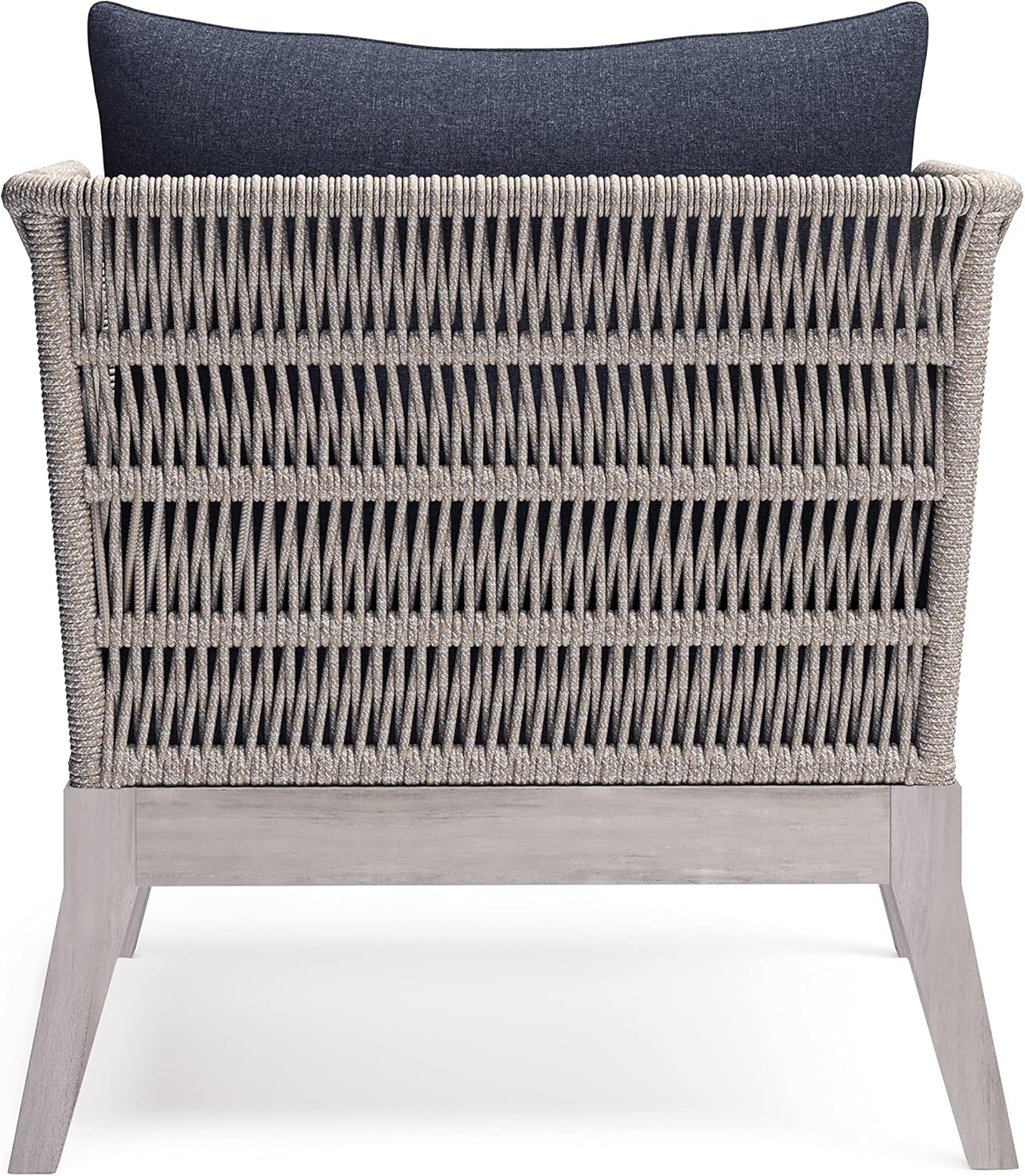 Outdoor Chair : Capable of completing our Santiago Outdoor Conversation set or standing out on its own, the alluring look of the Santiago Chair will be a standout addition to your outdoor patio or backyard area. The chair is designed with a unique feature where the frame of the back and arms are wrapped with highly durable woven rope in an intricate pattern. The sofa base and legs are built with solid acacia wood. Covering the thick, comfortable cushions is premium water repellent fabric. Paired with the coffee table and chairs the Santiago Outdoor Conversation Set will add a completely new dimension to your outdoor furniture