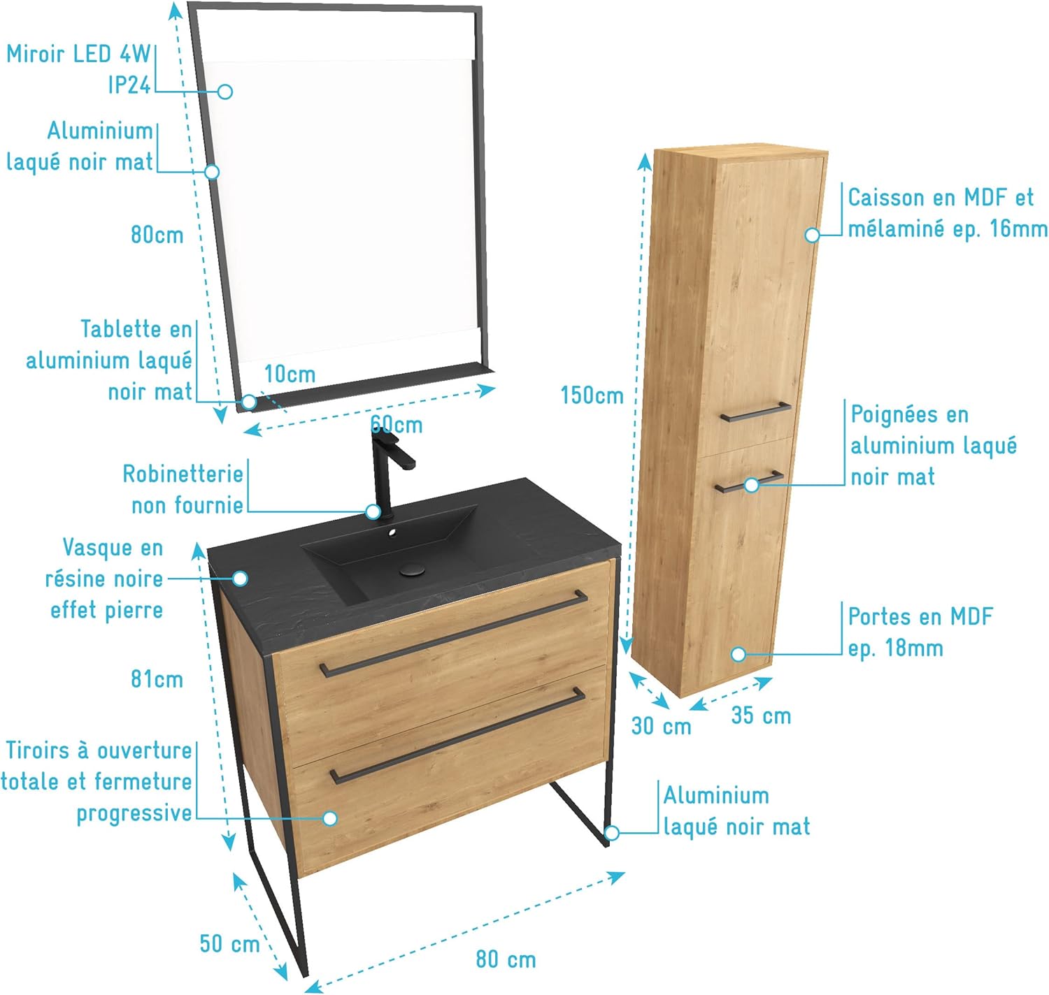 Bathroom furniture pack 80x50 cm oak brown, 2 drawers brown oak, stone effect black resin basin, matt black LED mirror and brown oak column, Structura P107. Furniture features: MDF and melamine cabinet with brown oak finish. Legs, matt black lacquered aluminium. Delivered fully assembled. Unit dimensions: 80 x 50 x 81 cm. Features of the washbasin: Black finish stone effect washbasin with overflow. Taps not included. Basin dimensions: 80 x 50 cm. Sink thickness: 4 cm. Drawer features: MDF drawer fronts in natural oak finish. Door thickness: 18 mm. Mirror features: Mirror with frame and shelf in matt black lacquered metal. 4W LED backlight. Dimensions: Mirror: 60 x 80 cm.