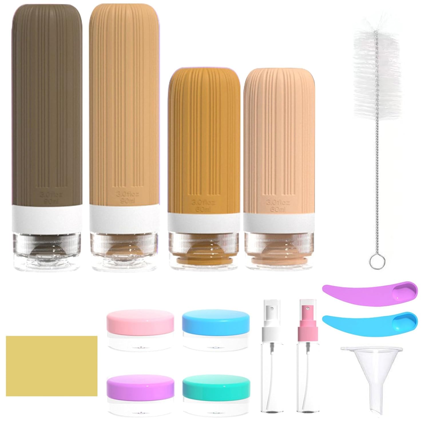PKRANZYHKAL Silicone Travel Bottles for Toiletries – The ultimate travel essentials set for organizing liquids on the go. This TSA-approved kit includes 2x 60ml and 2x 90ml silicone travel bottles (leak-proof & squeezable), 2 spray bottles for perfumes, a funnel, labels, bottle brush, and openers. Perfect as travel containers for toiletries, it securely holds shampoo, conditioner, lotion, and more. Compact (18.5x16.5x4cm, 253g) and eco-friendly, these travel size toiletries are vacation essentials and cruise must-haves. Durable, portable, and stylish—ideal for hassle-free travels.