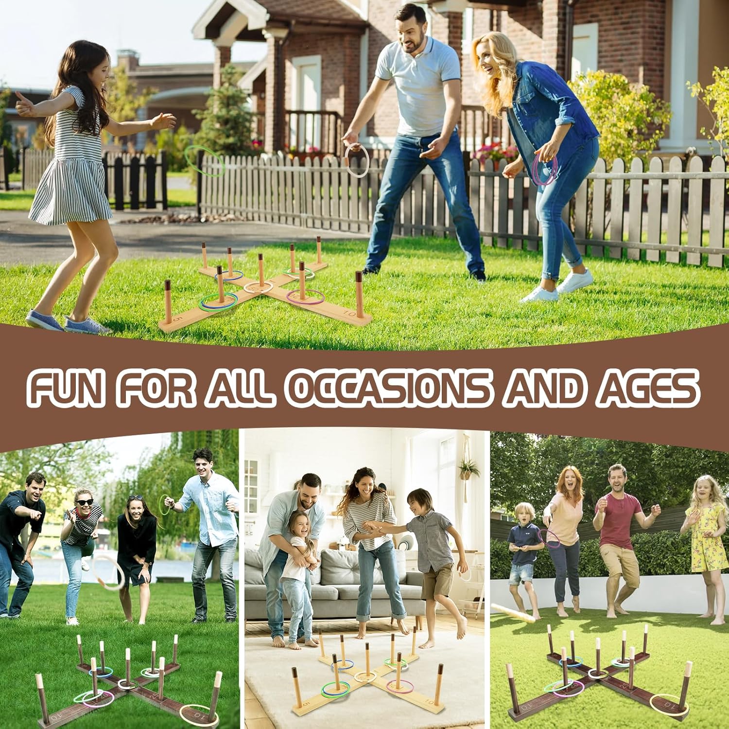 Elevate your outdoor gatherings with our Ring Toss Game, a beloved classic that promises hours of entertainment for all ages. Crafted with durability in mind, this game features robust materials that withstand enthusiastic play in various settings, from tranquil lawn games adults gatherings to lively outdoor game parties and bustling picnics. Its inclusive design ensures everyone can join in the fun, whether you're aiming for casual play or friendly competition with family and friends. This versatile yard game set includes a variety of rings, each offering a unique challenge to keep players engaged and entertained. From the soft, forgiving feel of foam rings to the traditional clink of wooden ones, every toss brings joy and satisfaction. Setting up is a breeze with no tools required, allowing you to start the fun in minutes. When the party moves, the convenient carrying bag makes transporting the game effortless, whether to the beach for a sunny day or the park for an afternoon of outdoor family games. More than just a game, our Ring Toss Game embodies nostalgia and togetherness, bringing generations together for shared moments of laughter and camaraderie. Designed for both indoor and outdoor use, it adapts seamlessly to any environment, ensuring every large outdoor games gathering is enhanced with a touch of classic amusement. Perfect for creating memories with family and friends, it's a must-have addition to any collection of outdoor family games, promising endless hours of fun and bonding in every season.