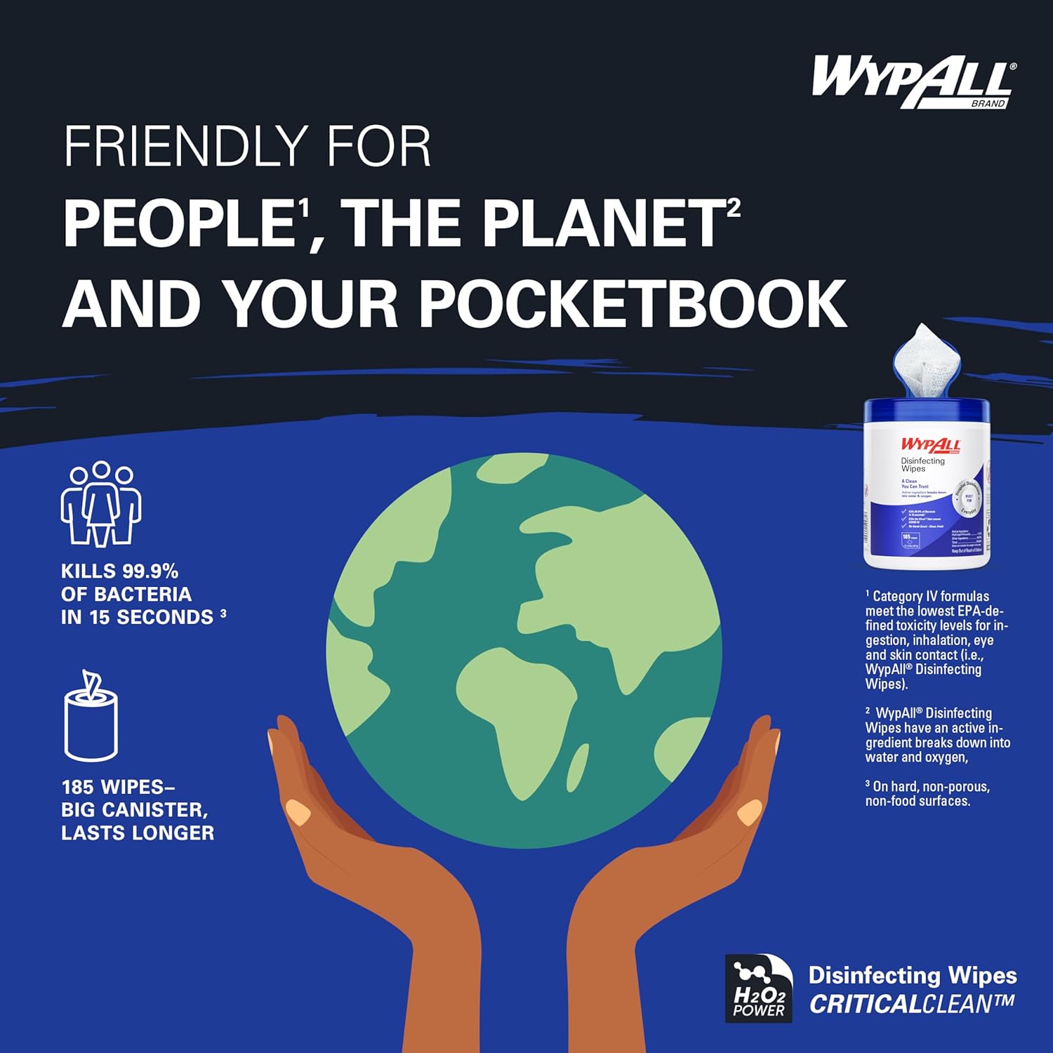 WypAll® Disinfecting Wipes offer a Clean You Can Trust with chemicals you can pronounce – at a price you can afford. Activated with biodegradable hydrogen peroxide, the clean, fresh-scented WypAll® formula packs a punch by killing pathogens such as Norovirus and the COVID-19 virus while being approved for use in commercial, industrial, and healthcare settings. It is also designed to meet the lowest EPA-defined human toxicity levels for disinfecting wipes, which means they can be labeled without the "Hazards to Humans" or "Wash Hands After Use" warnings typically noted on the vast majority of disinfecting wipes canisters. Configured for businesses, WypAll® Disinfecting Wipes come in canisters with a high sheet count. WypAll® Disinfecting Wipes deliver a reasonable cost per wipe with efficient storage, making it easier to handle for your people, the planet, and your pocketbook.