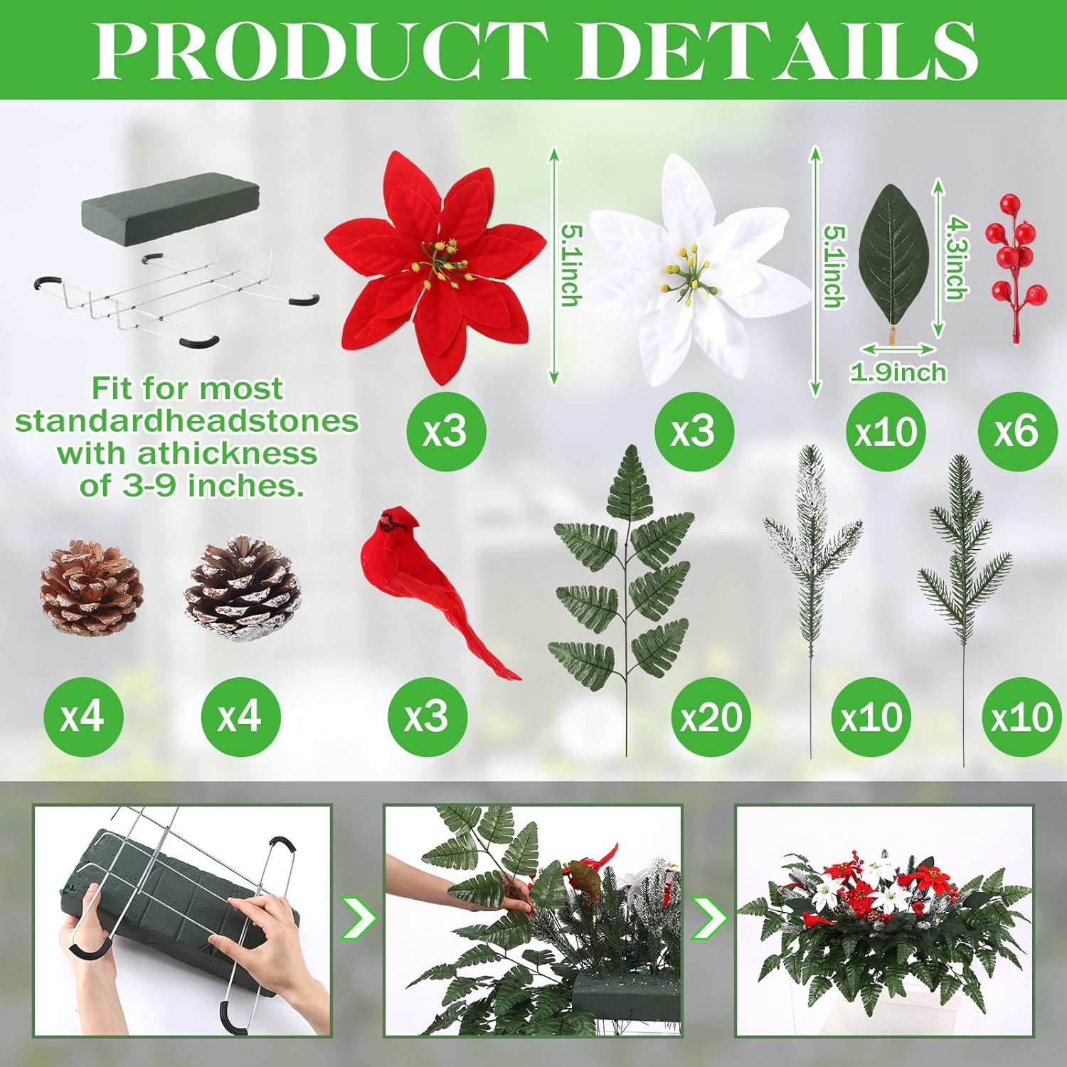 Features: These Christmas headstone saddles for graves are suitable for sending to your friends, colleagues, relatives, neighbors, family members and others you care and love, they will be happy to receive these gifts. The Christmas cemetery decorations for grave are easy to install, bringing the headstone elegance while showing your condolence. You can replace the flowers regularly to keep the cemetery beautiful and attractive. Specifications: Material: main plastic, foam, wire, silk cloth Color: main red, white, green Size: Red birds: 4.33 inches/ 11 cm Christmas poinsettias: 5.12 inches/ 13 cm in diameter Artificial berry stems: 3.15 inches/ 8 cm in length Pine needles branches: 10.24 inches/ 26 cm Pine cone: 1.57 inches/ 4 cm Silk leather leaf fern: 16.14 inches/ 41 cm Magnolia leaves: 4.33 inches/ 11 cm Package includes: 1 Set Christmas artificial cemetery flowers Notes: Manual measurement, please allow slight errors on size. The color may exist a slight difference due to different screen displays. Small parts included, please keep away from little kids to avoid swallowing risk.