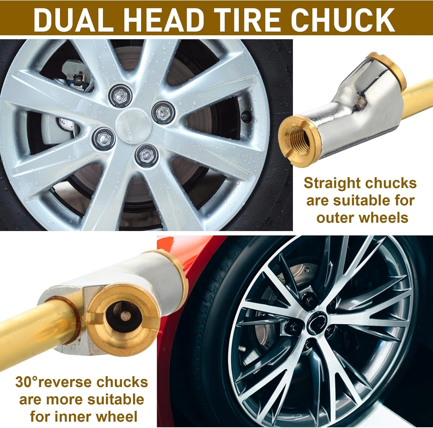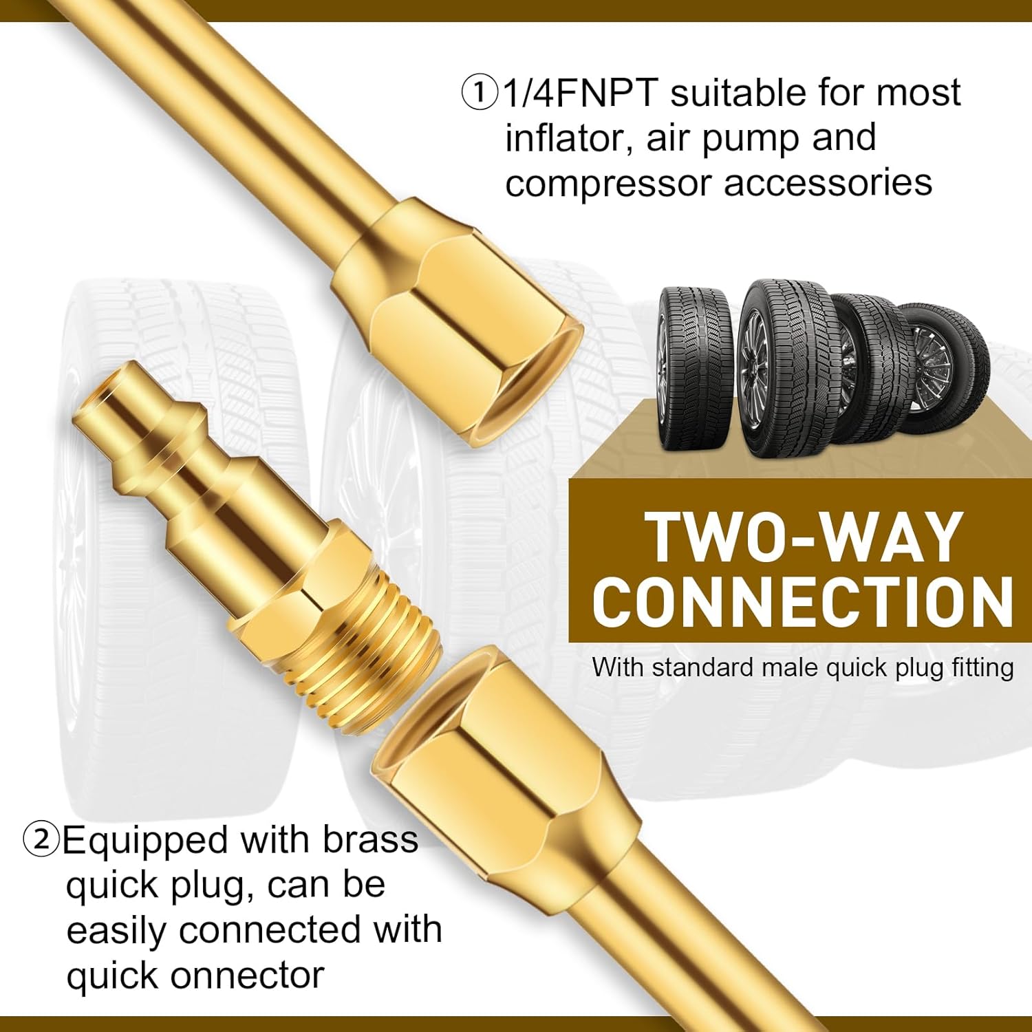Features: Maximum working pressure: 150psi Inlet thread: 1/4"FNPT Specifications: Size: 12'' Material: zinc alloy head, extended copper tube, tape Color: gold Package Included: 5 x Air chuck 5 x Standard quick plug 5 x Tape Warm notes: Manual measurement, please allow slight errors in size. The color may slightly differ due to different screen displays