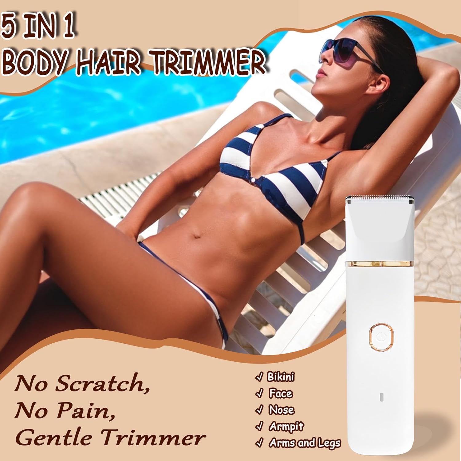 Bikini Trimmer for Women, 5-in-1 Electric Razors Shaver, IPX7 Waterproof Cordless Body Hair Trimmer, Rechargeable Facial & Pubic Hair Remover, Ceramic Blade Bikini Shaver, Gifts for Women (White)