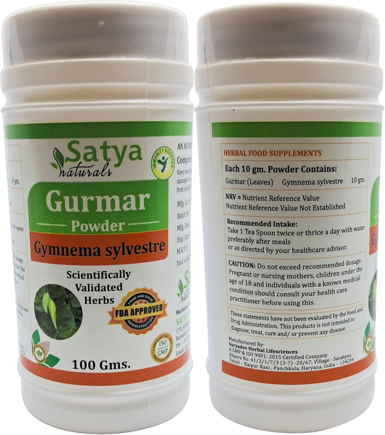 Gudmar, also known as Gymnema Sylvestre, is a renowned Ayurvedic herb traditionally used for its potential health benefits. Satya Naturals Gudmar Powder is meticulously sourced and crafted to provide a high-quality supplement for both men and women. Pure and Natural: 100% natural Gymnema Sylvestre powder without any additives or fillers. Ayurvedic Remedy: Rooted in ancient Ayurvedic traditions, known for supporting overall wellness. Quality Assured: Carefully processed to retain the herb's natural properties, ensuring the best possible product. Versatile Use: Can be easily incorporated into your daily routine; mix with water, smoothies, or your favorite beverage. Directions for Use: Take 1-2 teaspoons of Gudmar Powder daily, or as recommended by your healthcare professional. Mix with water, juice, or smoothies for optimal results. Packaging: Comes in a sealed 100 gms. pack to maintain freshness and potency.