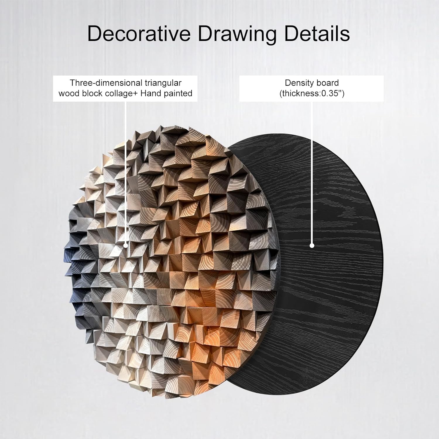 This unique triangular pine wood three-dimensional decorative wall panel adds a touch of natural and modern artistic atmosphere to your home or commercial space with its unique design and exquisite craftsmanship. The wall panel size is Diameter 23.6" inches, with carefully designed triangular pine blocks arranged in a staggered manner, creating a visually layered and three-dimensional effect.