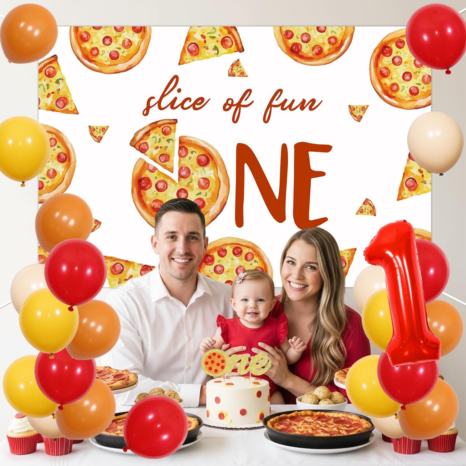 | Included Components | 13 Pieces of Pizza Theme 1 Year Old Birthday Photo Banner, Double-Sided Glitter Paper Golden Orange Red Pizza Theme 1st Birthday Cake Topper, Pizza Themed One High Chair Banner, Pizza Theme One Backdrop, 32 Inch Red Number 1 Foil Balloon, 4*12 Inch Red Matte Latex Balloon, 4*12 Inch Retro Apricot Matte Latex Balloon, 4*12 Inch Retro Mustard Yellow Matte Latex Balloon, 4*12 Inch Retro Hermes Orange Matte Latex Balloon, 10M White Balloon Ribbon, 2*Transparent Plastic Straw, Double-Sided Transparent Gel Dots |
