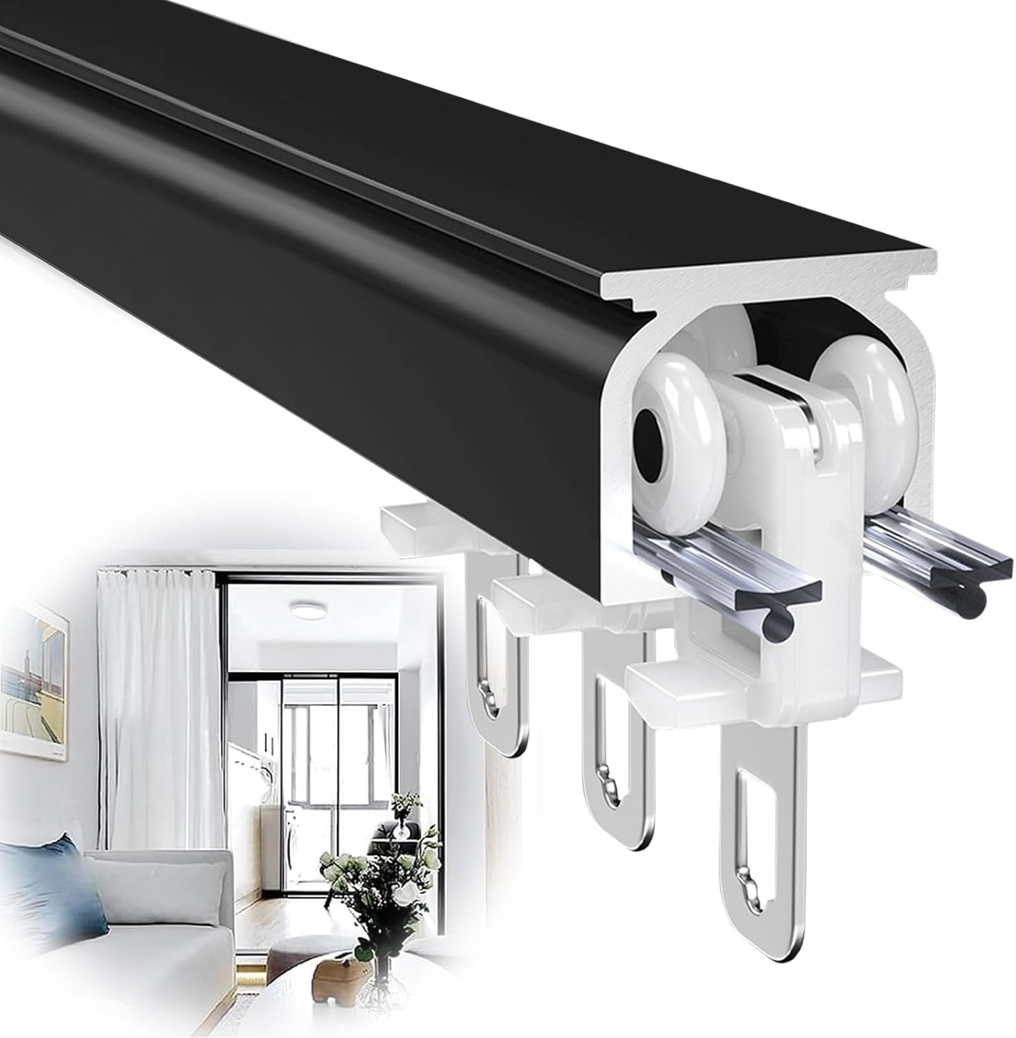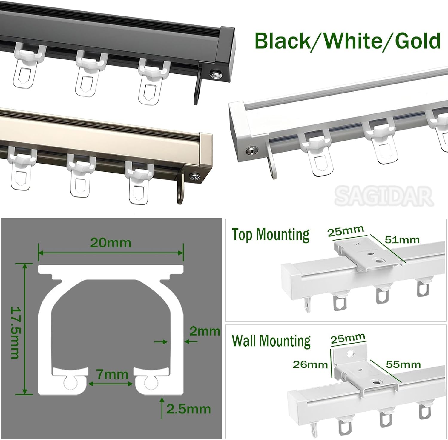 Sliding curtain track with thick mounting brackets to hold curtains in place. Track connectors included for extra support▣ Features:1. Thickened aluminum alloy material, durable, smooth surface, not easy to rust2. Built-in mute rod with stainless steel pulley, no noise, smooth sliding3. Alloy seal, square design, black/white/golden color.Due to the limitation of packaging size by logistics, products under 140 cm are shipped as a whole, and products over 140 cm are evenly distributed. Please note that the use of connectors will not affect the normal use of the product▣ Product details- Name: curtain track/curtain rod- Material: aluminum alloy- Shape: square- Type: straight rail- Color: black, white, gold- Wall thickness: 2 mm - 2.5 mm- Dimensions: 50 cm - 600 cm- Overall height: 40 mm- Mounting: wall/hanging (2 mounting accessories included)▣ Fittings- Pulleys: 8 pcs/m- Seals: 2pcs/set- Mounting code 2 pcs/m- Connector: 1/1.4m▣ Please note that the color of the product may vary slightly due to differences in light and resolution.▣ Please measure the required dimensions accurately before purchasing. The size is measured manually and may have a slight error.